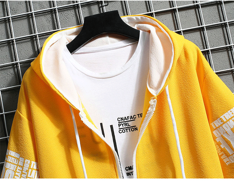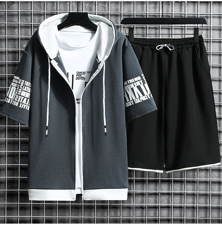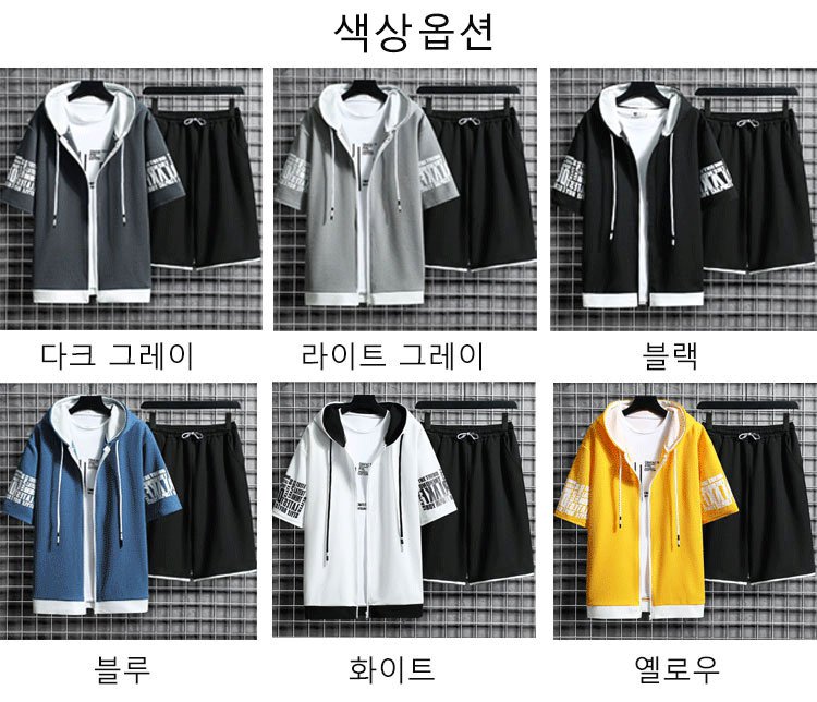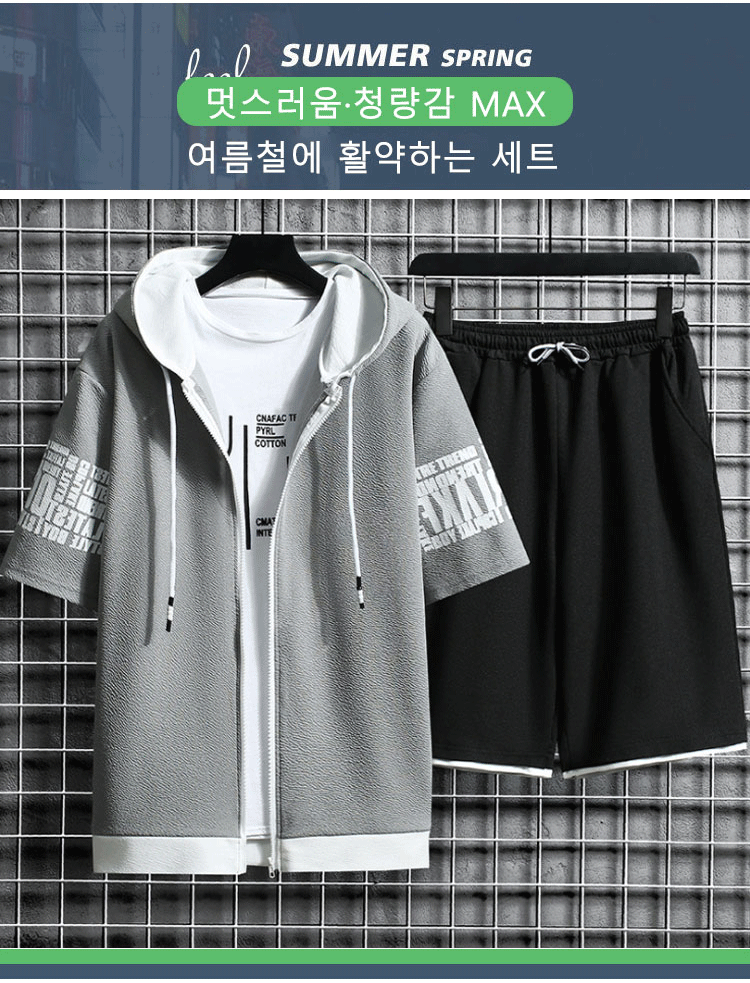 후드 반팔 코트 × 반바지  여름철에 활약하는 세트,항상 산뜻하고 쾌적. 1세트₩37,900;2세트₩49,900